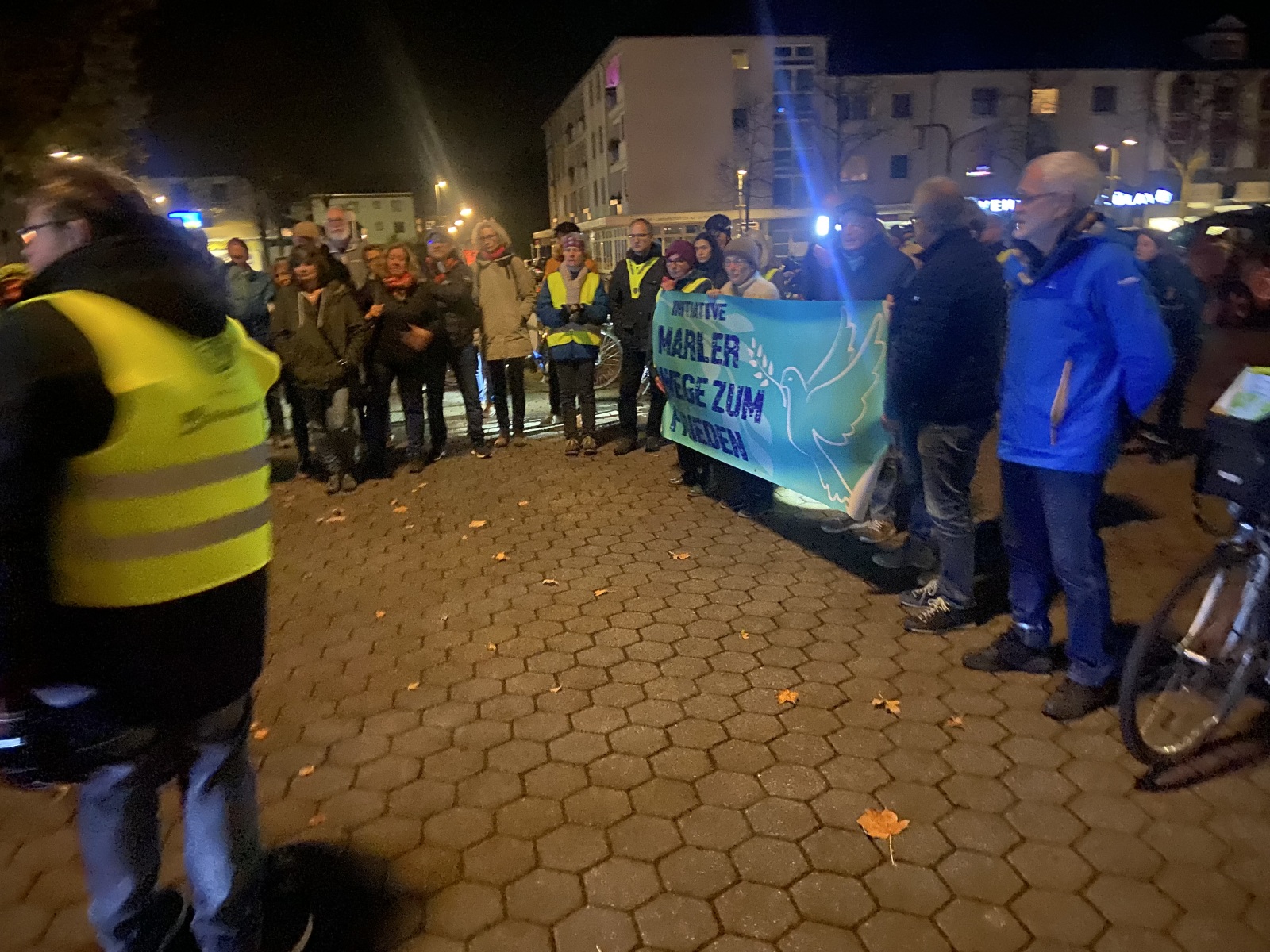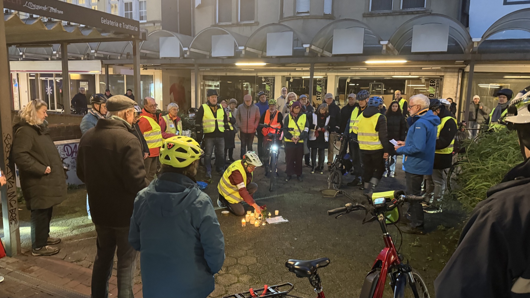 In einer gemeinsamen Aktion vom Radentscheid Marl und der Marler Friedensinitiative fuhren am 9.November 2025 am späten Sonntagnachmittag ca 50 Radfahrende (und weitere Fußgänger bzw Autofahrende) zu zahlreichen Stolpersteine im Stadtgebiet, in Hüls und vor allem Brassert. Dort wurde der Ermordeten gedacht: in der Mehrzahl Jüdinnen und Juden, auch einige Jehovas Zeugen (wegen ihres Nein zum Kriegsdienst). Abschluss war Loestr. 26: das Haus, wo Familie Abrahamsohn gelebt hatte und wo am 9.11.38 Nazis gewütet hatten; hier hatte bis Ende 2021 der letzte Überlebende Rolf Abrahamsohn im hohen Alter gelebt (hier gibt es bisher noch keinen Stolperstein).